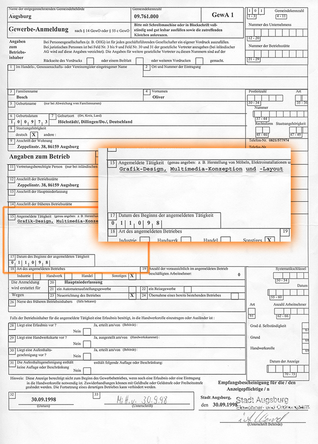 So also gesagt – getan: am 1. Oktober 1998 schreibt sich unser Protagonist zum Studienbeginn an der Fachhochschule für Gestaltung Augsburg ein und just am selben Tag wird auf dem Bürgeramt ein selbständiges Gewerbe eingetragen: Boschmedia ist geboren.